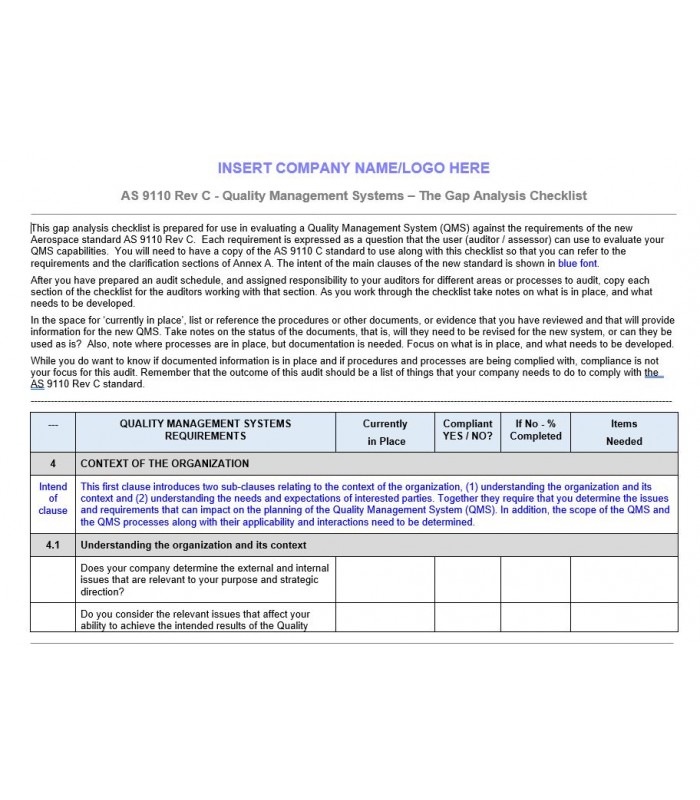 This gap analysis checklist is best suited for aviation, space, and defense organizations who are seeking initial registration to the AS standards. The checklist is a very useful tool for use in evaluating your quality management system against the requirements of the new Aerospace standard AS 9110 Rev C.