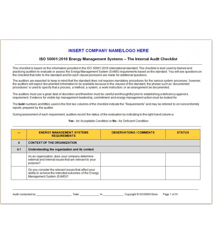 This checklist is based on the information provided in the latest ISO 50001:2018 edition of the international standard. The checklist is best used by trained and practicing auditors to evaluate or assess Energy Management Systems (EnMS) requirements based on the standard. You will see questions on the checklist that refer to the standard and for each clause provisions are made for additional questions.
