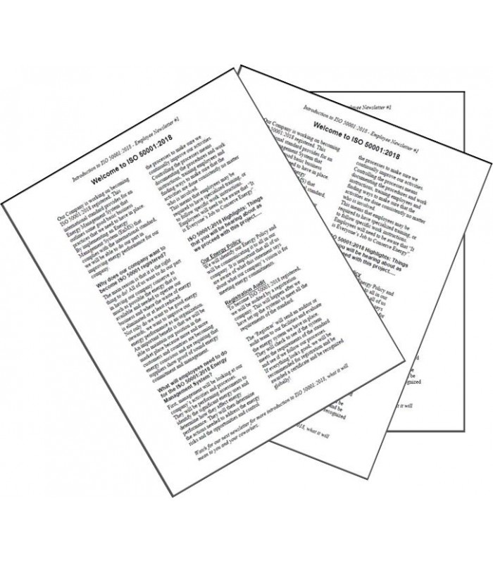 Keep your employees informed and involved in the ISO 50001:2018 project. Employee awareness is a critical aspect of a successful project. The Energy Management System belongs to everyone in the organization and needs to be followed and maintained by each employee. These Newsletters improve awareness and knowledge of ISO 50001:2018 in your organization.