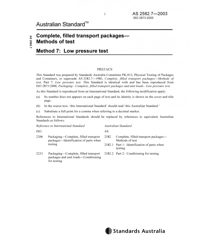 AS 2582.7-2003 [ Current ] Complete, filled transport packages - Methods of test, Method 7: Low pressure test