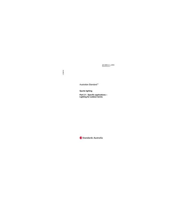 Specifies requirements specific to lighting outdoor tennis courts and examines the particular visual tasks associated with this sport. Lighting levels are specified for national/international, club competition/commercial and recreational/residential levels of play, but lighting for television broadcasting is not included. To be read in conjunction with AS 2560.1. Deals with the same technical areas as the 1982 edition but includes requirements as well as recommendations, the requirements applying to measurement techniques and acceptable levels of various lighting parameters. Other changes include the introduction of a second uniformity measurement, glare rating requirements and specified locations for illuminance and glare calculations or measurements.