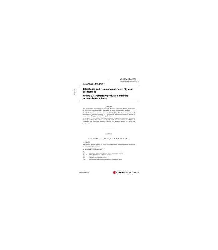 AS 1774.32-2002 [ Current ] Refractories and refractory materials - Physical test methods, Method 32: Refractory products containing carbon - Test methods