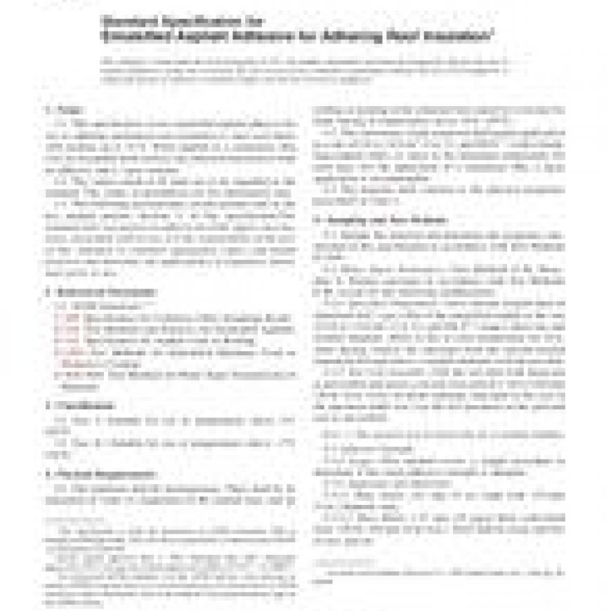 1.1 This specification covers emulsified asphalt adhesive for use in adhering preformed roof insulation to steel roof decks with inclines up to 33 %. When applied as a continuous film over an acceptable deck surface, the emulsion functions as both an adhesive and a vapor retarder.