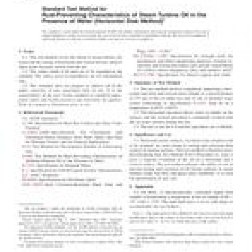 1.1 This test method covers the ability of steam-turbine oils to prevent the rusting of horizontal and vertical ferrous surfaces when water becomes mixed with the oil.
