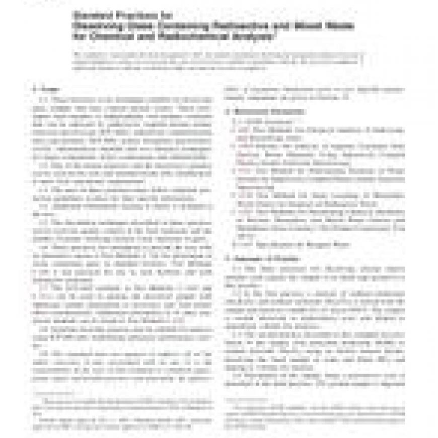 1.1 These practices cover techniques suitable for dissolving glass samples that may contain nuclear wastes. These techniques used together or independently will produce solutions that can be analyzed by inductively coupled plasma atomic emission spectroscopy (ICP-AES), inductively coupled plasma mass spectrometry (ICP-MS), atomic absorption spectrometry (AAS), radiochemical methods and wet chemical techniques for major components, minor components and radionuclides.