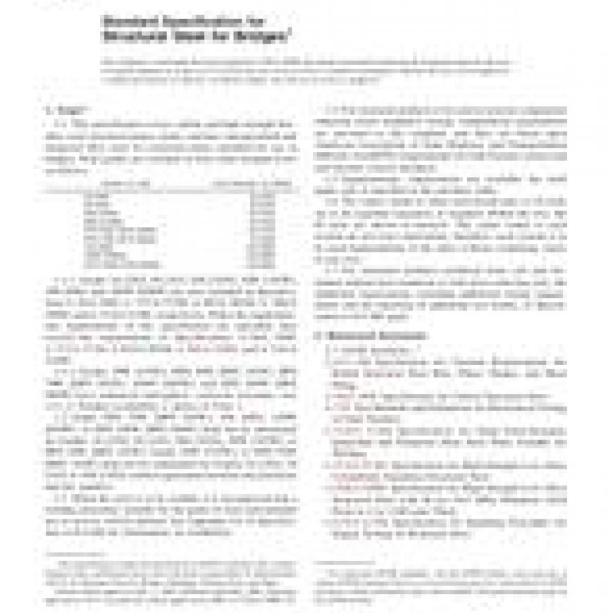 1.1 This specification covers carbon and high-strength low-alloy steel structural shapes, plates, and bars and quenched and tempered alloy steel for structural plates intended for use in bridges. Nine grades are available in four yield strength levels as follows: