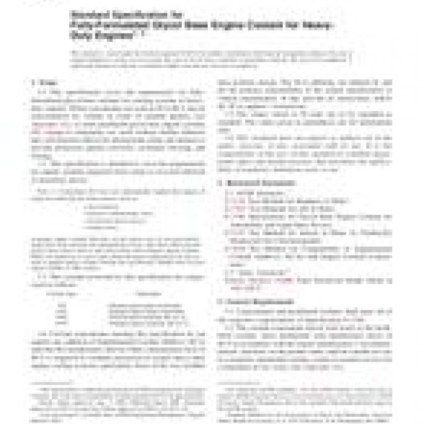 1.1 This specification covers the requirements for fully-formulated glycol base coolants for cooling systems of heavy-duty engines. When concentrates are used at 40 to 60 % glycol concentration by volume in water of suitable quality, (see ), or when prediluted glycol base engine coolants (50 volume % minimum) are used without further dilution, they will function effectively during both winter and summer to provide protection against corrosion, cavitation, freezing, and boiling.