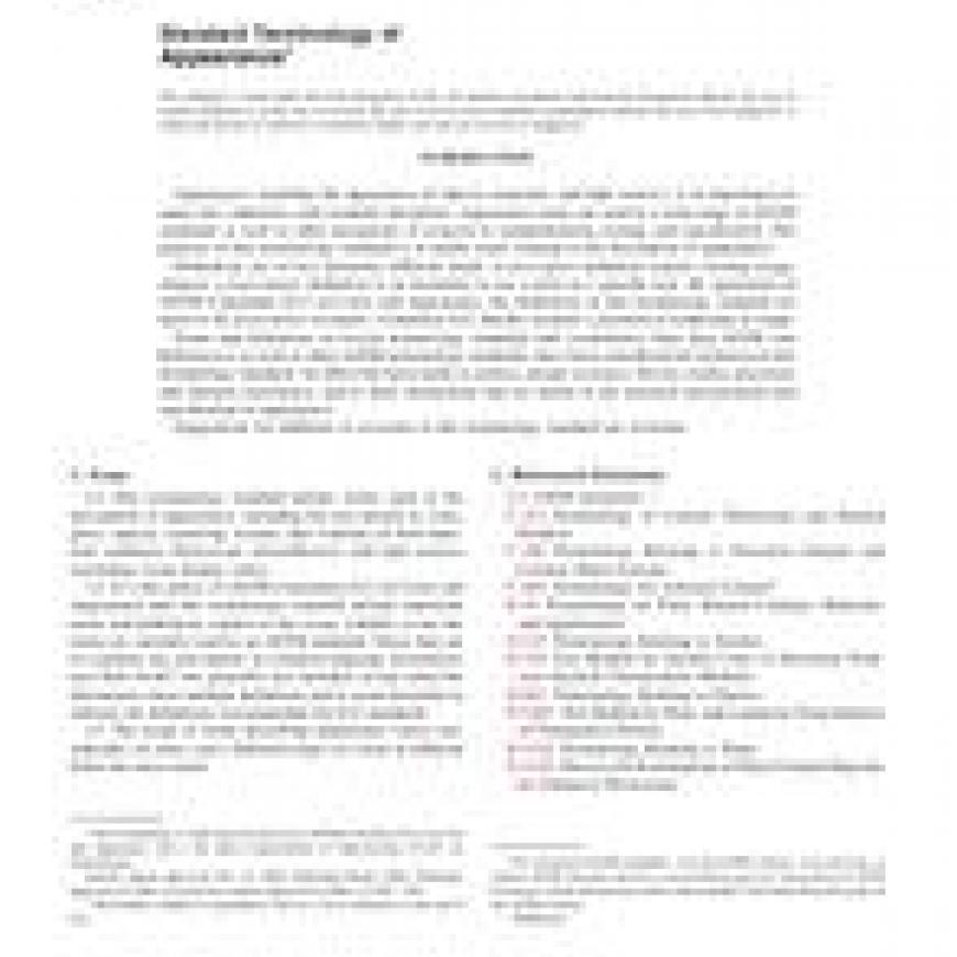 1.1 This terminology standard defines terms used in the description of appearance, including but not limited to color, gloss, opacity, scattering, texture, and visibility of both materials (ordinary, fluorescent, retroreflective) and light sources (including visual display units).
