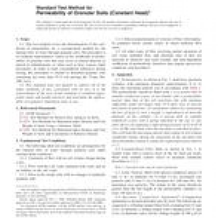 1.1 This test method covers the determination of the coefficient of permeability by a constant-head method for the laminar flow of water through granular soils. The procedure is to establish representative values of the coefficient of permeability of granular soils that may occur in natural deposits as placed in embankments, or when used as base courses under pavements. In order to limit consolidation influences during testing, this procedure is limited to disturbed granular soils containing not more than 10 % soil passing the 75-m (No. 200) sieve.