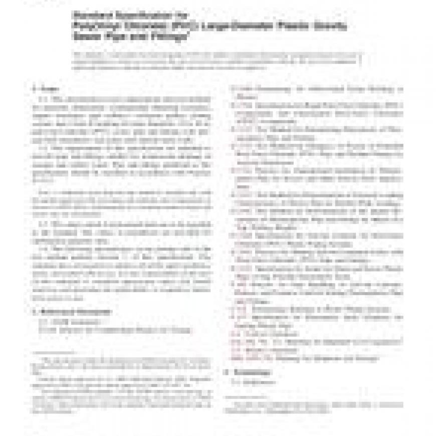 1.1 This specification covers requirements and test methods for materials, dimensions, workmanship, flattening resistance, impact resistance, pipe stiffness, extrusion quality, joining system, and a form of marking for large diameters, 18 to 48 in. poly(vinyl chloride) (PVC) sewer pipe and fittings with integral bell elastomeric seal joints and smooth inner walls.