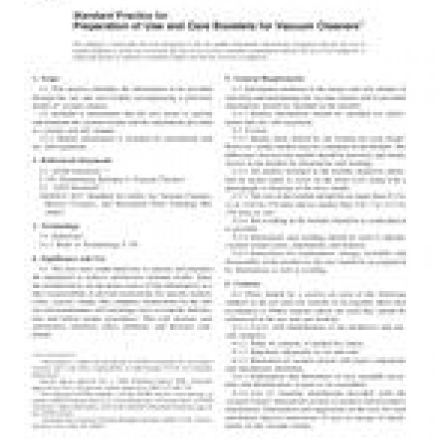 1.1 This practice identifies the information to be provided through the use and care booklet accompanying a particular model of vacuum cleaner.