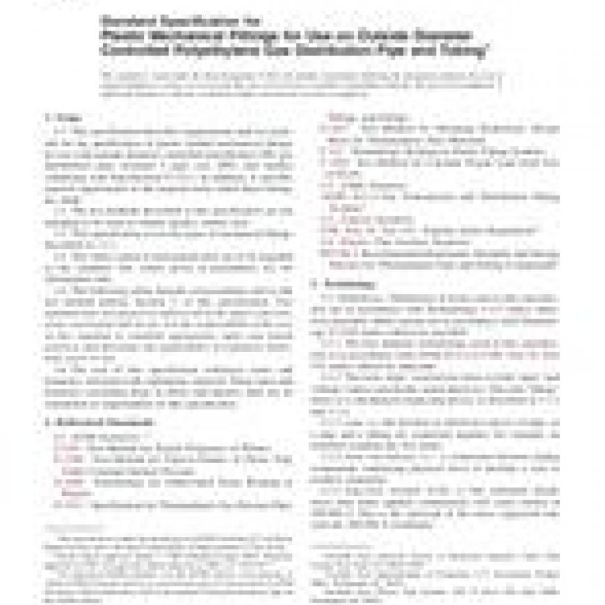 1.1 This specification describes requirements and test methods for the qualification of plastic bodied mechanical fittings for use with outside diameter controlled polyethylene (PE) gas distribution pipe, nominal 2 pipe size (IPS) and smaller complying with Specification D 2513. In addition, it specifies general requirements of the material from which these fittings are made.