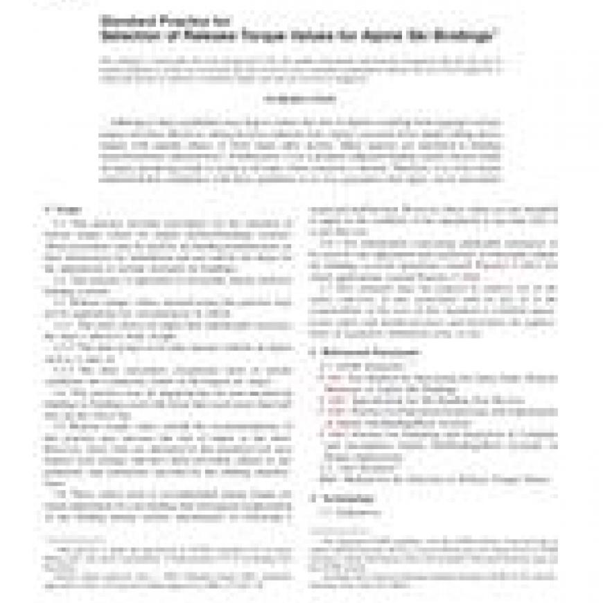 1.1 This practice provides procedures for the selection of release torque values for Alpine ski/boot/bindings systems. These procedures may be used by ski binding manufacturers in their instructions for installation and use and by ski shops for the adjustment of already mounted ski bindings.