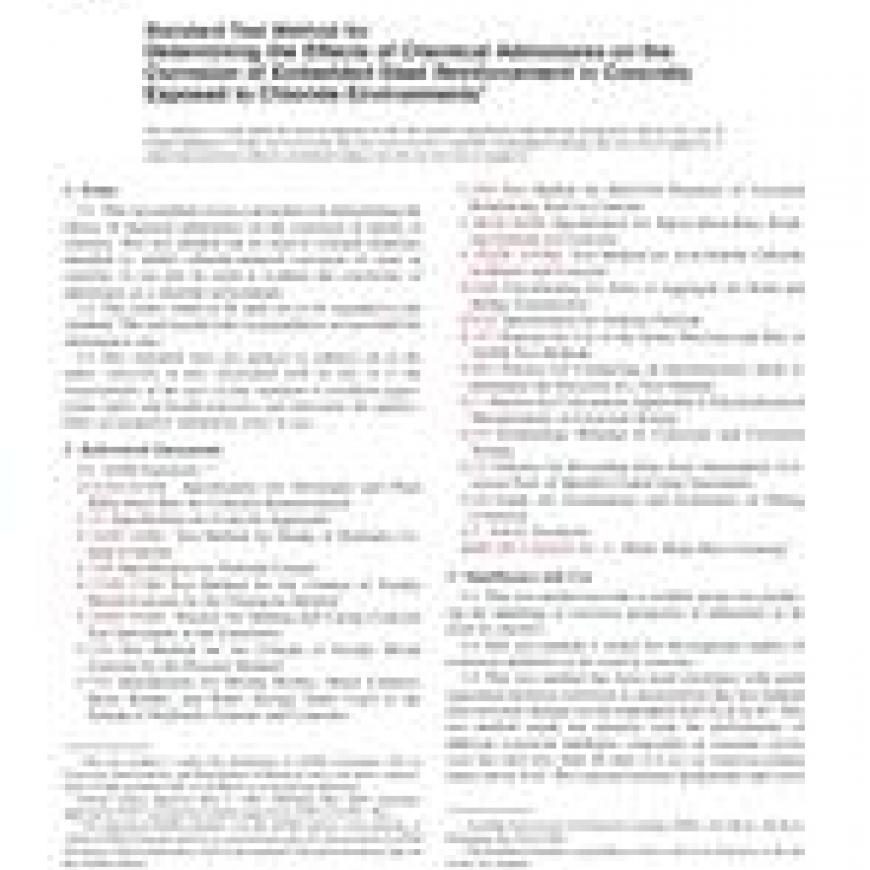 1.1 This test method covers a procedure for determining the effects of chemical admixtures on the corrosion of metals in concrete. This test method can be used to evaluate materials intended to inhibit chloride-induced corrosion of steel in concrete. It can also be used to evaluate the corrosivity of admixtures in a chloride environment.