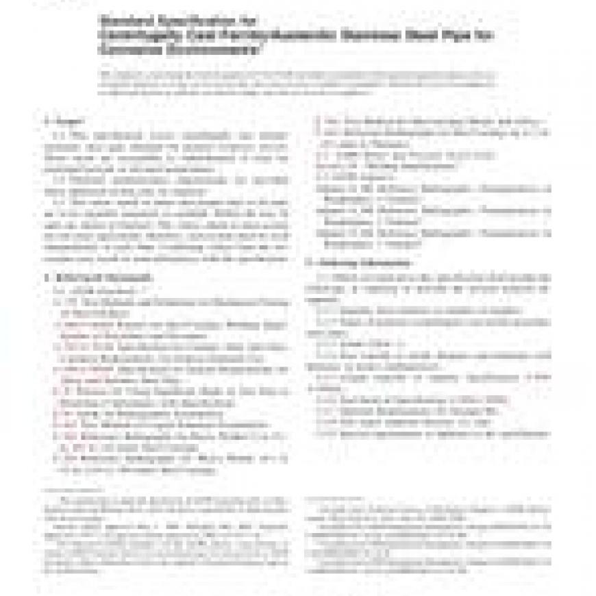 1.1 This specification covers centrifugally cast ferritic/austenitic steel pipe intended for general corrosive service. These steels are susceptible to embrittlement if used for prolonged periods at elevated temperatures.