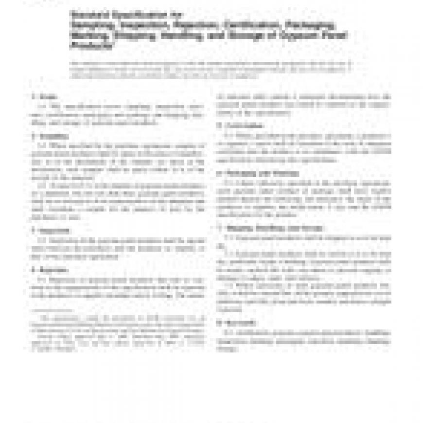 1.1 This specification covers sampling; inspection; rejection; certification; packaging and marking; and shipping, handling, and storage of gypsum panel products.