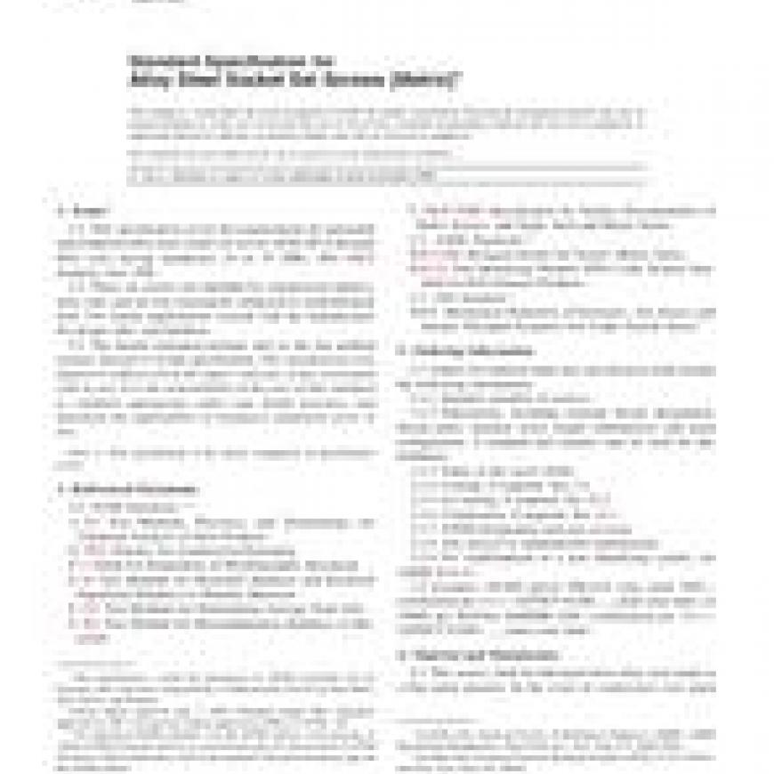 1.1 This specification covers the requirements for quenched and tempered alloy steel socket set screws (SSS) M1.6 through M24 sizes having hardnesses 45 to 53 HRC, ISO 898/5 property class 45H.
