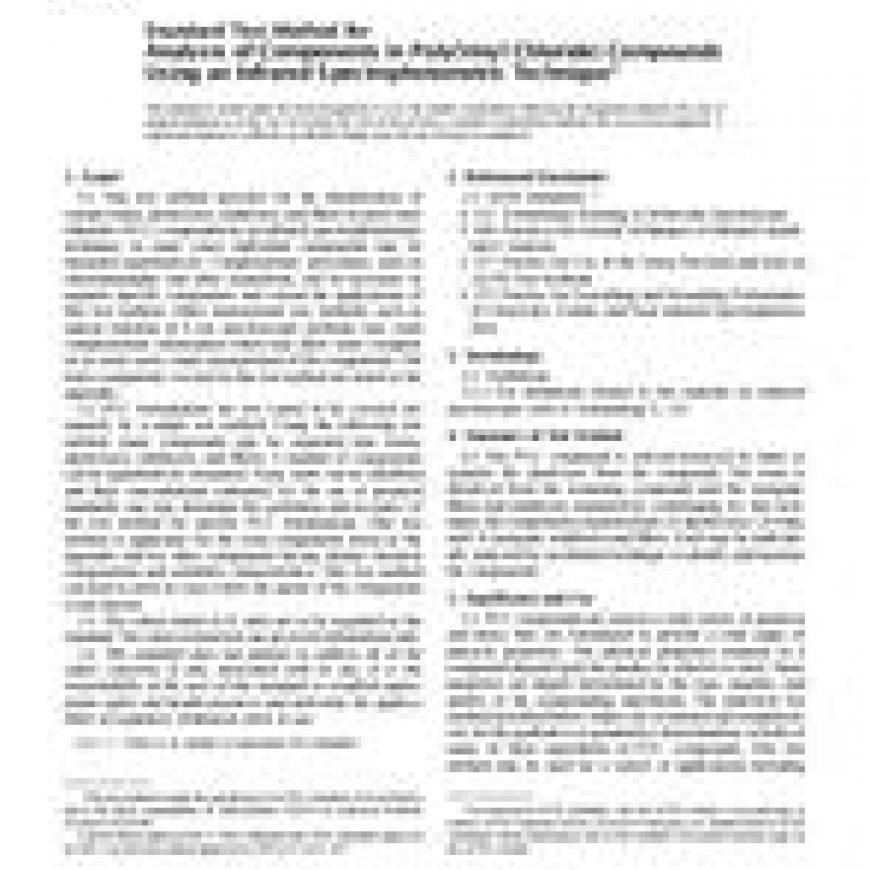 1.1 This test method provides for the identification of certain resins, plasticizers, stabilizers, and fillers in poly(vinyl chloride) (PVC) compounds by an infrared spectrophotometric technique. In many cases, individual components may be measured quantitatively. Complementary procedures, such as chromatographic and other separations, will be necessary to separate specific components and extend the applications of this test method. Other instrumental test methods, such as optical emission or X-ray spectroscopic methods, may yield complementary information which may allow more complete or, in some cases, easier measurement of the components. The resin components covered in this test method are listed in the appendix.