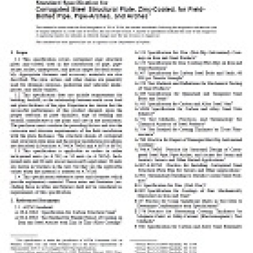 1.1 This specification covers corrugated steel structural plate, zinc-coated, used in the construction of pipe, pipe-arches, arches, underpasses, and special shapes for field assembly. Appropriate fasteners and accessory materials are also described. The pipe, arches, and other shapes are generally used for drainage purposes, pedestrian and vehicular underpasses, and utility tunnels.