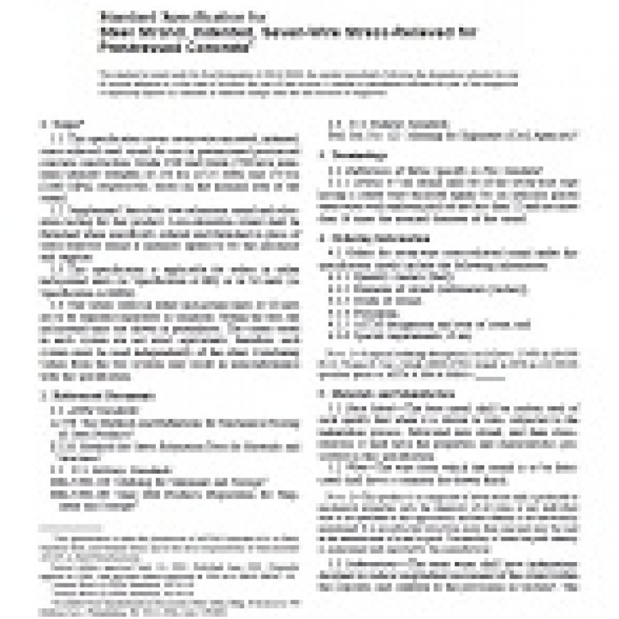 1.1 This specification covers seven-wire uncoated, indented, stress-relieved steel strand for use in pretensioned prestressed concrete construction. Grade 250I and Grade 270I have minimum ultimate strengths of 250 ksi [1725 MPa] and 270 ksi [1860 MPa], respectively, based on the nominal area of the strand.
