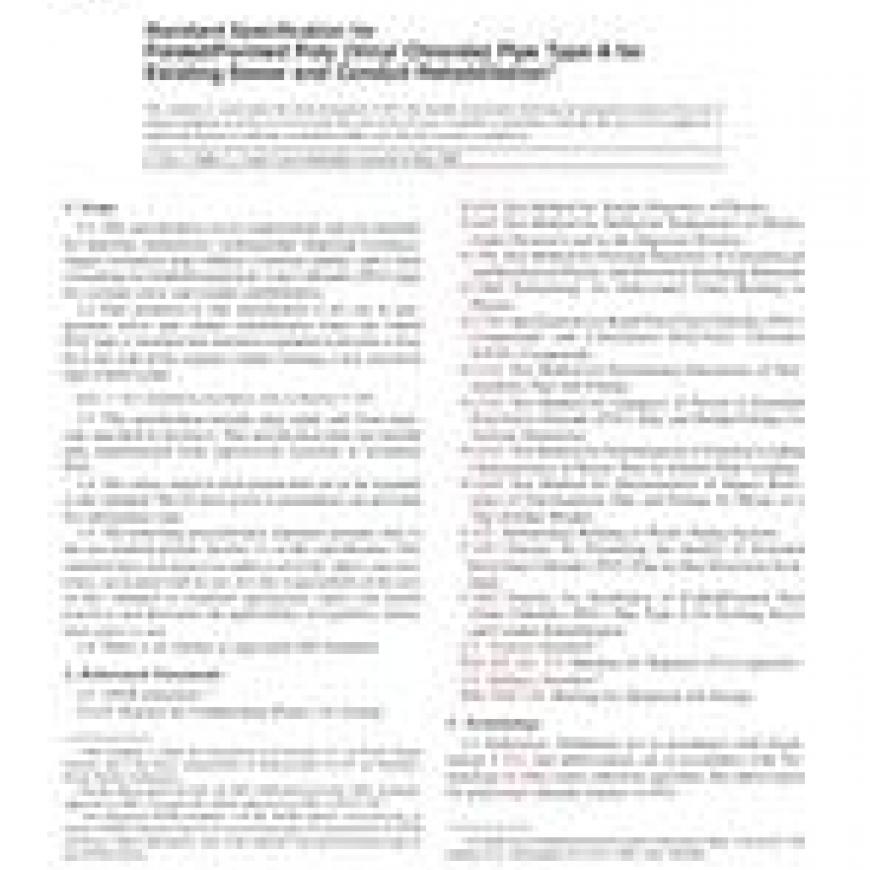 1.1 This specification covers requirements and test methods for materials, dimensions, workmanship, flattening resistance, impact resistance, pipe stiffness, extrusion quality, and a form of marking for folded/formed poly (vinyl chloride) (PVC) pipe for existing sewer and conduit rehabilitation.