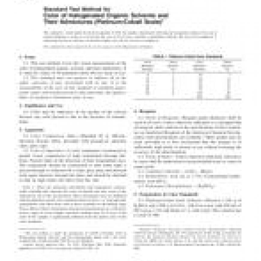 1.1 This test method covers the visual measurement of the color of halogenated organic solvents and their admixtures. It is valid for values of 50 platinum-cobalt (Pt-Co) units or less.
