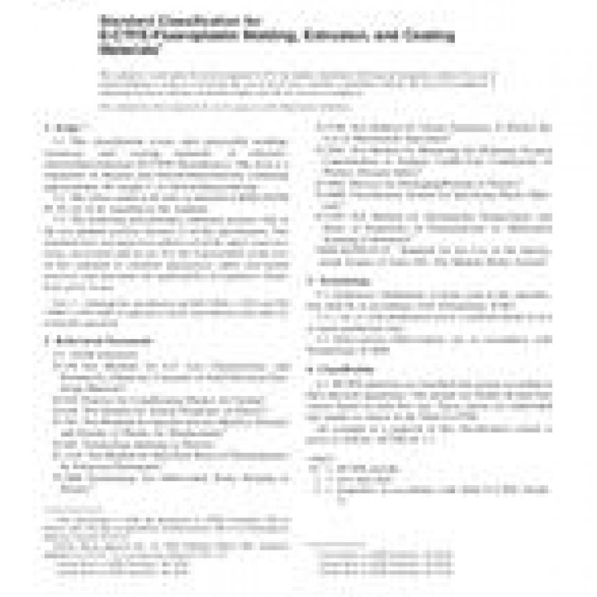 1.1 This classification covers melt processible molding, extrusion, and coating materials of ethylene-chlorotrifluoroethylene (E-CTFE) fluoroplastics. The resin is a copolymer of ethylene and chlorotrifluoroethylene containing approximately 80 weight % of chlorotrifluoroethylene.