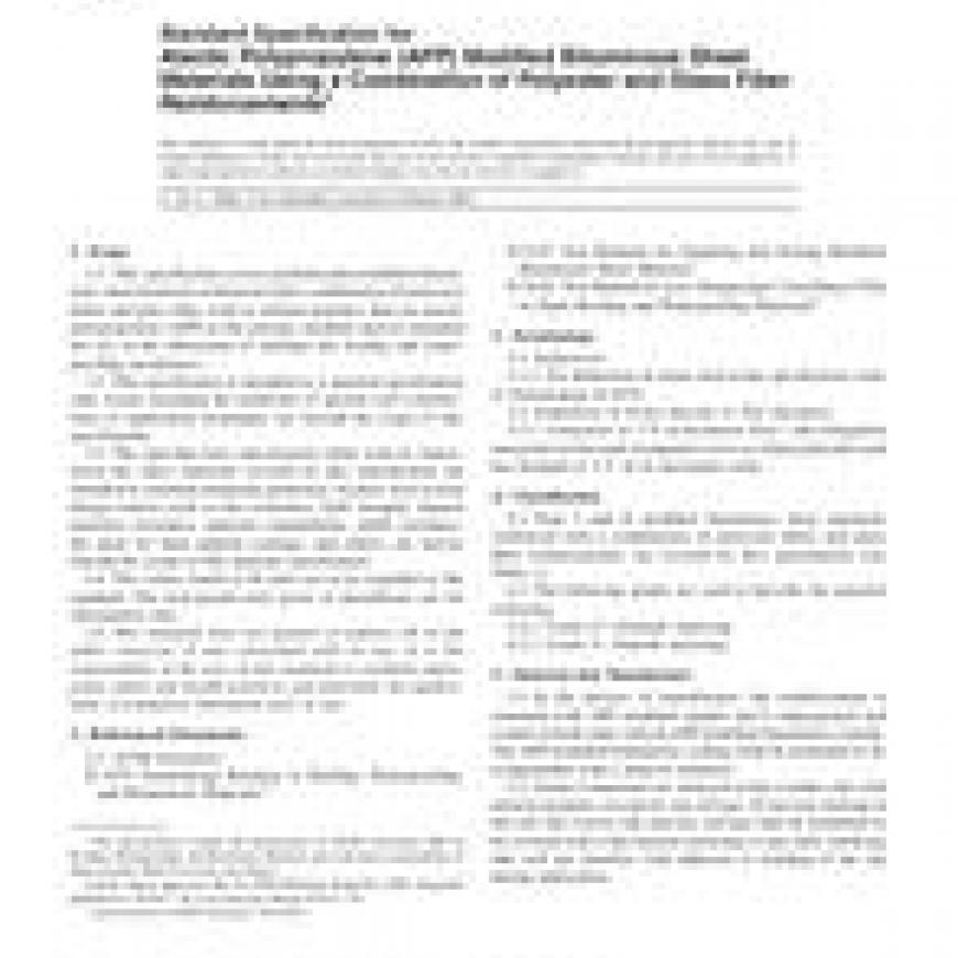 1.1 This specification covers prefabricated modified bituminous sheet materials reinforced with a combination of polyester fabric and glass fiber, with or without granules, that use atactic polypropylene (APP) as the primary modifier and are intended for use in the fabrication of multiple ply roofing and waterproofing membranes.