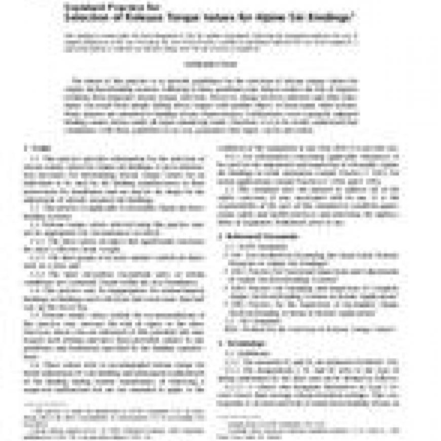 1.1 This practice provides information for the selection of release torque values for Alpine ski bindings. It gives information necessary for determining release torque values for an individual to be used by ski binding manufacturers in their instructions for installation and use and by ski shops for the adjustment of already mounted ski bindings.