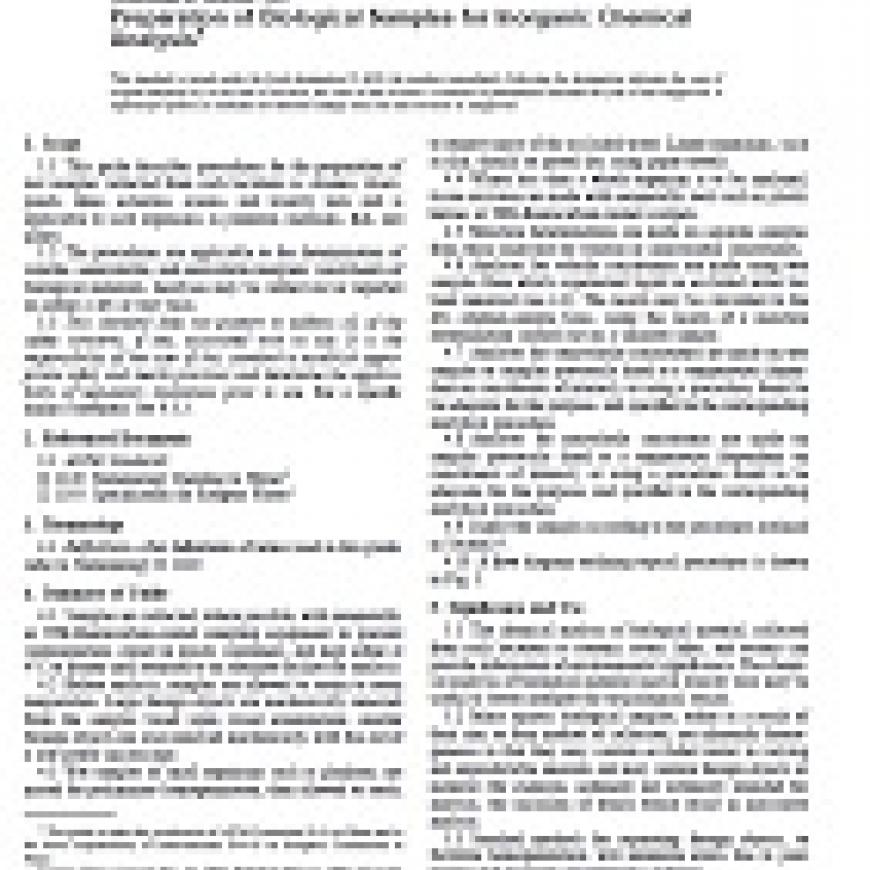 1.1 This guide describes procedures for the preparation of test samples collected from such locations as streams, rivers, ponds, lakes, estuaries, oceans, and toxicity tests and is applicable to such organisms as plankton, mollusks, fish, and plants.