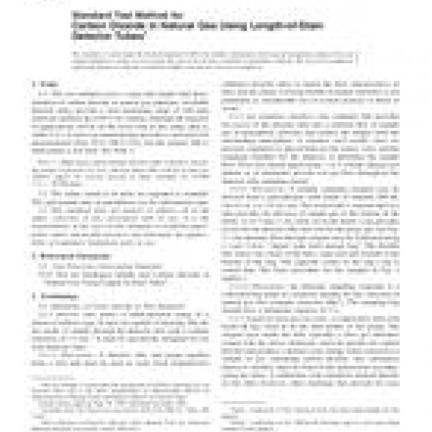 1.1 This test method covers a rapid and simple field determination of carbon dioxide in natural gas pipelines. Available detector tubes provide a total measuring range of 100 ppm (parts per million) up to 60% by volume although the majority of applications will be on the lower end of this range (that is, under 5%). At least one manufacturer provides a special kit for measurements from 10 to 100% CO , but the normal 100-cc hand pump is not utilized. See Note 1.