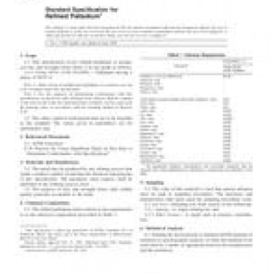 Note 1-Other forms of unfabricated palladium of commerce are not to be excluded under this specification. Note 2-For the purposes of determining conformance with this specification, an observed value obtained from analysis shall be rounded to the nearest unit in the last right hand place of figures used in expressing the limiting value, in accordance with the rounding method of Practice E29.1.2 The values stated in inch-pound units are to be regarded as the standard. The values given in parentheses are for information only.