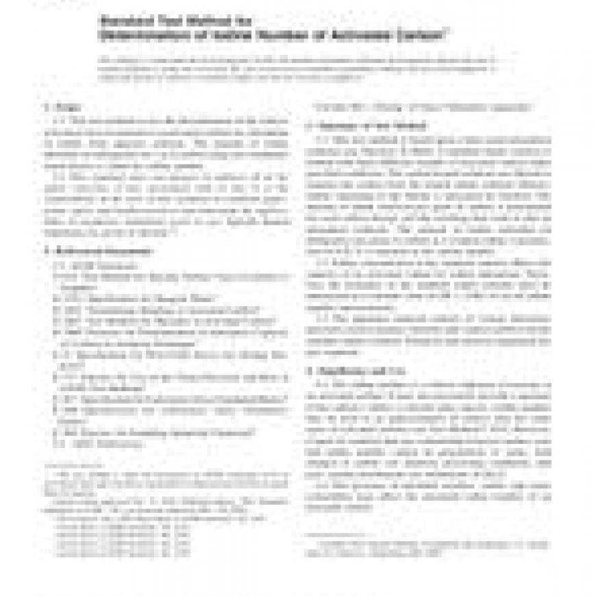 1.1 This test method covers the determination of the relative activation level of unused or reactivated carbons by adsorption of iodine from aqueous solution. The amount of iodine absorbed (in milligrams) by 1 g of carbon using test conditions listed herein is called the iodine number.