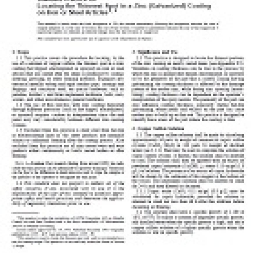 1.1 This practice covers the procedure for locating, by the use of a solution of copper sulfate, the thinnest spot in a zinc coating (hot dipped, electroplated, or sprayed) on iron or steel articles that are coated after the shape is produced by casting, drawing, pressing, or other forming methods. Examples are: electrical metallic tubing and rigid conduit pipe, castings and forgings, and structural steel; on special hardware, such as poleline, builder's, and farm implement hardware; bolts, nuts, screws, and other miscellaneous general hardware.