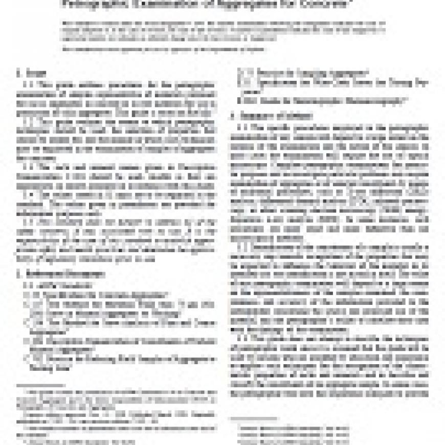 1.2 This guide outlines the extent to which petrographic techniques should be used, the selection of properties that should be looked for, and the manner in which such techniques may be employed in the examination of samples of aggregates for concrete.