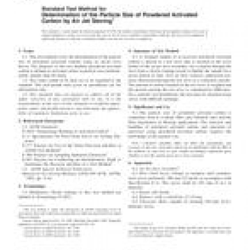 1.1 This test method covers the determination of the particle size of powdered activated carbons using an air-jet sieve device. For purposes of this test method, powdered activated carbon is defined as activated carbon in particle sizes predominantly smaller than 80 mesh.