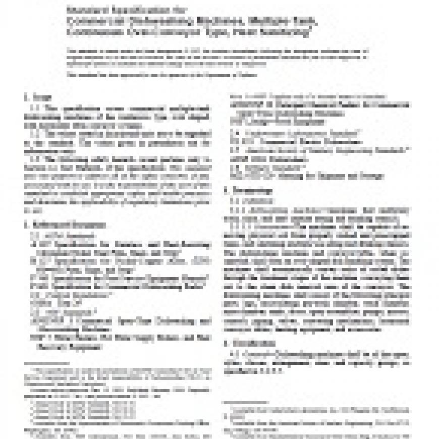 1.1 This specification covers commercial multiple-tank dishwashing machines of the continuous type, oval shaped, with horizontal table conveyor systems.