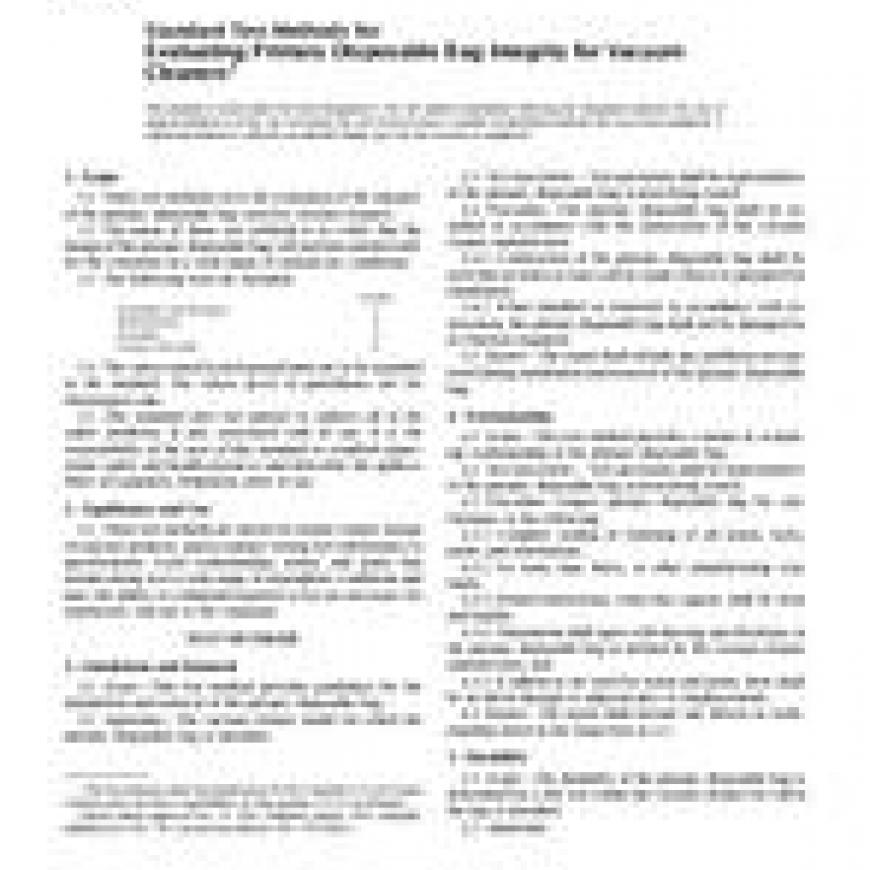 1.1 These test methods cover the evaluation of the integrity of the primary disposable bag used for vacuum cleaners.