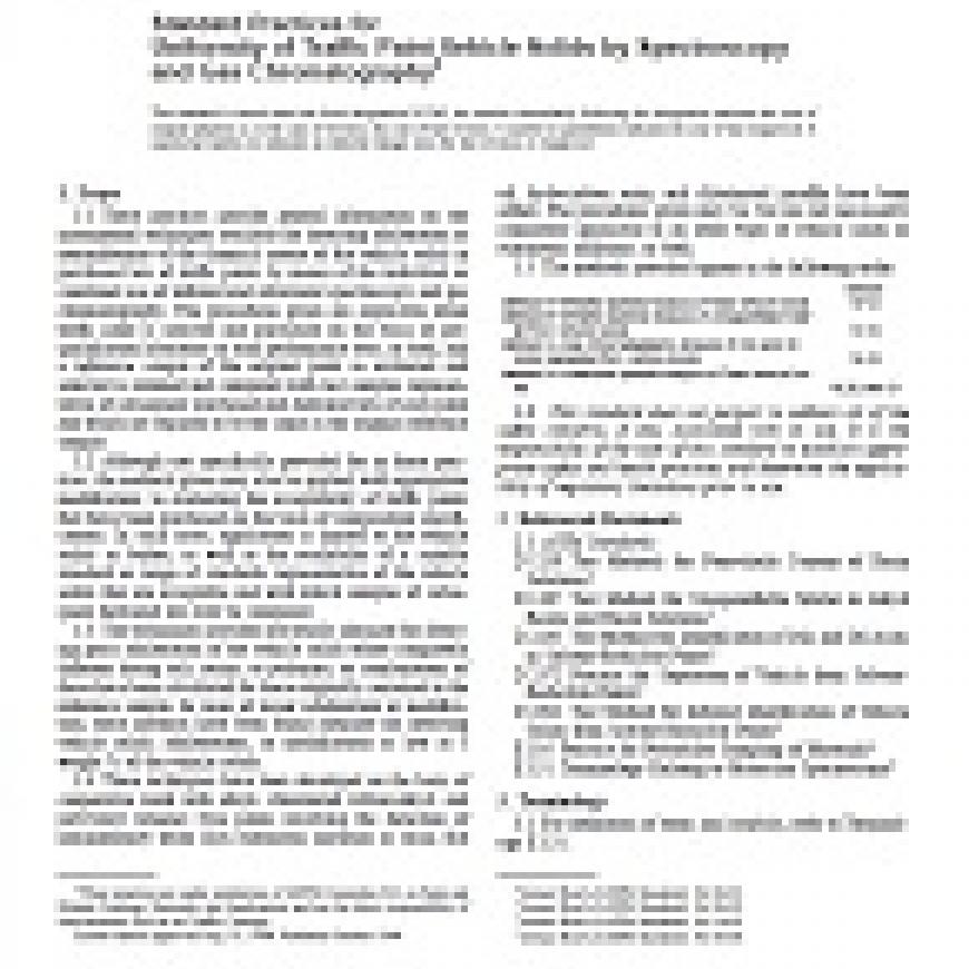 Section Method A---Infrared Spectral Analysis of Total Vehicle Solids 10 to 12 Method B---Infrared Spectral Analysis of Unsaponifiable Matter from Vehicle Solids 13 to 15 Method C---Gas Chromatographic Analysis of Oils and Oil Acids Separated from Vehicle Solids 16 to 18 Method D---Ultraviolet Spectral Analysis of Total Vehicle Solids 19 to 211.6 This standard does not purport to address all of the safety problems, if any, associated with its use. It is the responsibility of the user of this standard to establish appropriate safety and health practices and determine the applicability of regulatory limitations prior to use.>