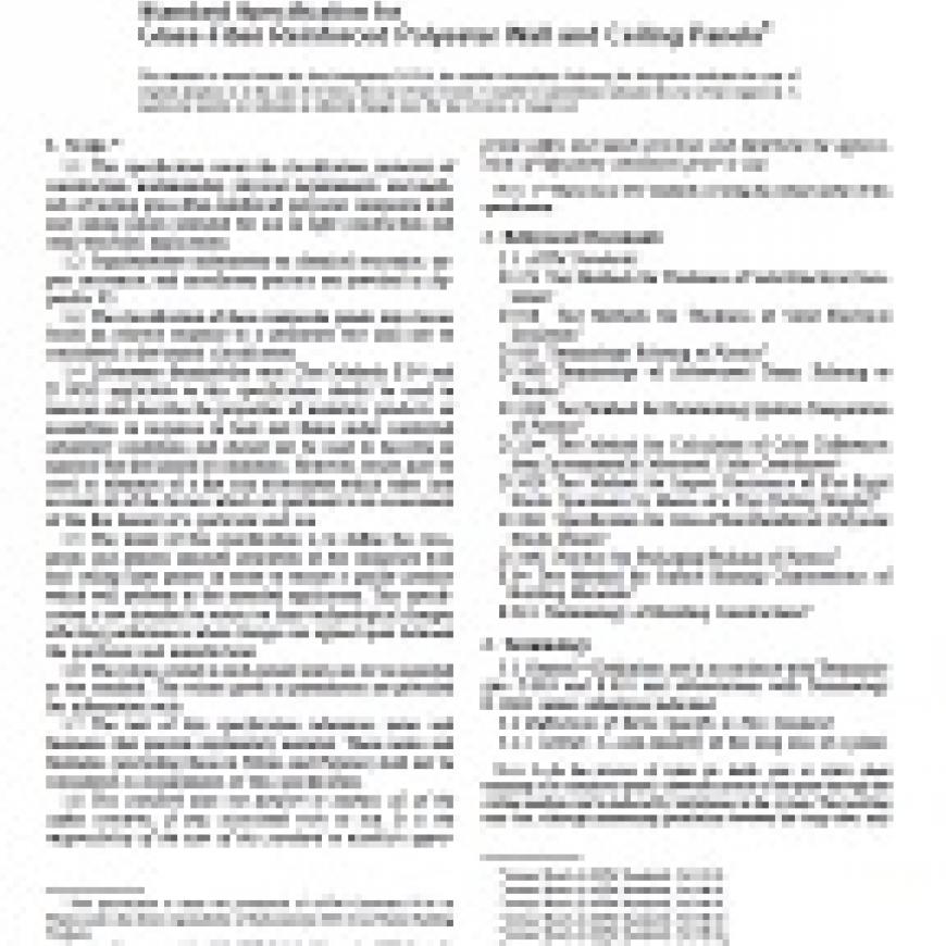 1.1 This specification covers the classification, materials of construction, workmanship, physical requirements, and methods of testing glass-fiber-reinforced polyester composite wall and ceiling panels intended for use in light construction and semi-structural applications.