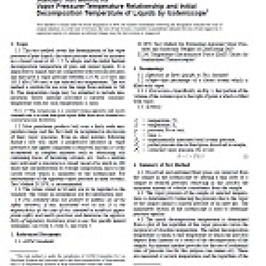 1.1 This test method covers the determination of the vapor pressure of pure liquids, the vapor pressure exerted by mixtures in a closed vessel at 40 + 5% ullage, and the initial thermal decomposition temperature of pure and mixed liquids. It is applicable to liquids that are compatible with borosilicate glass and that have a vapor pressure between 133 Pa (1.0 torr) and 101.3 kPa (760 torr) at the selected test temperatures. The test method is suitable for use over the range from ambient to 748 K. The temperature range may be extended to include temperatures below ambient provided a suitable constant-temperature bath for such temperatures is used.