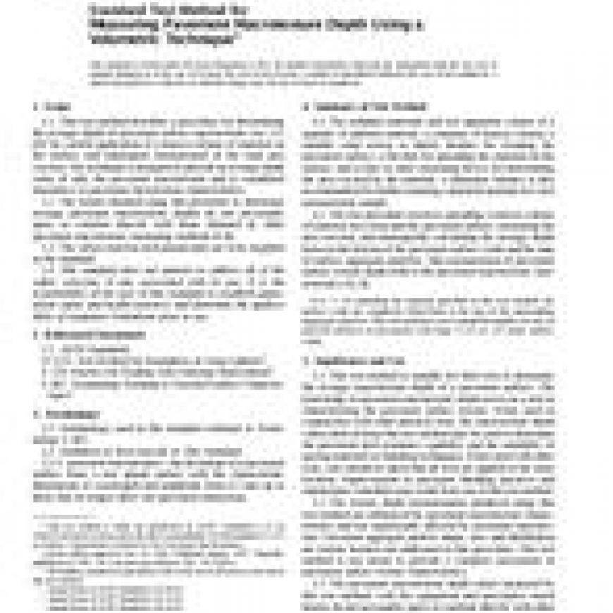 1.1 This test method describes a procedure for determining the average depth of pavement surface macrotexture (see 3.1) (1) by careful application of a known volume of material on the surface and subsequent measurement of the total area covered. The technique is designed to provide an average depth value of only the pavement macrotexture and is considered insensitive to pavement microtexture characteristics.