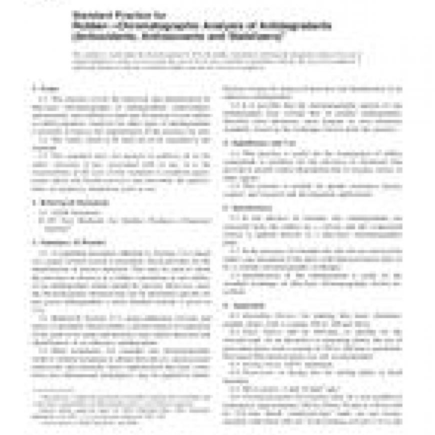 1.1 This practice covers the detection and identification by thin-layer chromatography of antidegradants (antioxidants, antiozonants, and stabilizers) that may be present in raw rubber or rubber products. Analysis for other types of antidegradants is possible as long as the requirements of the practice are met.
