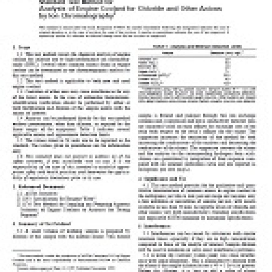1.1 This test method covers the chemical analysis of engine coolant for chloride ion by high-performance ion chromatography (HPIC). Several other common anions found in engine coolant can be determined in one chromatographic analysis by this test method.