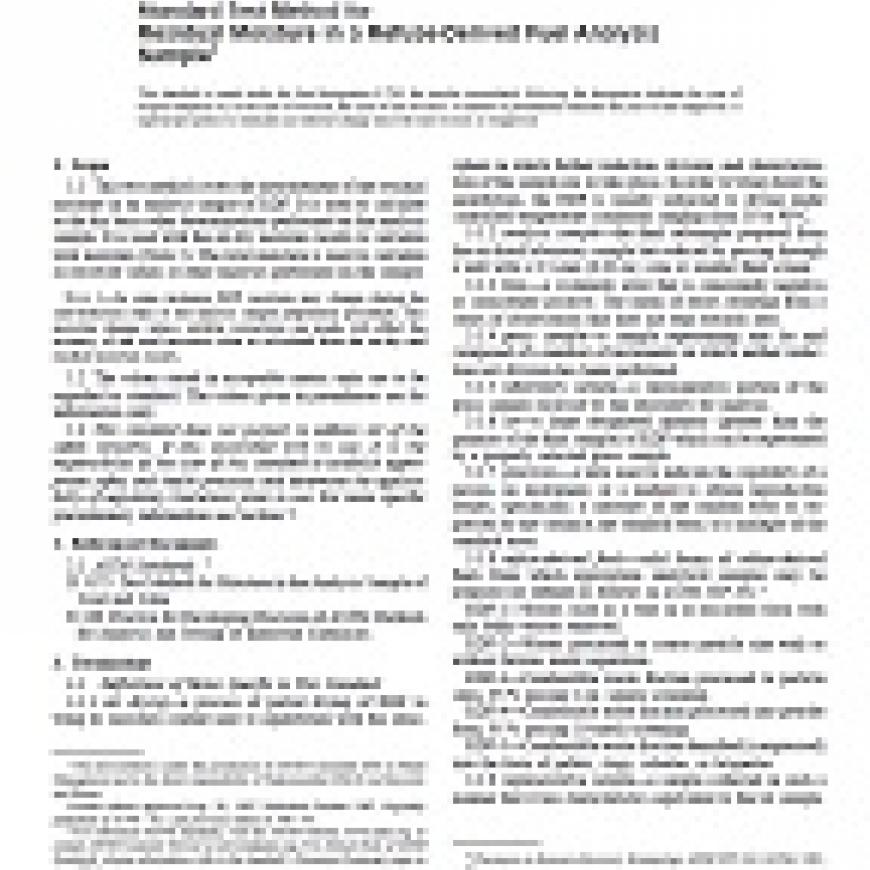 1.1 This test method covers the measurement of the residual moisture in an analysis sample of RDF. It is used to calculate to the dry basis other determinations performed on the analysis sample. It is used with the air-dry moisture results to calculate total moisture (Note 1). The total moisture is used to calculate as-received values or other analyses performed on the sample.