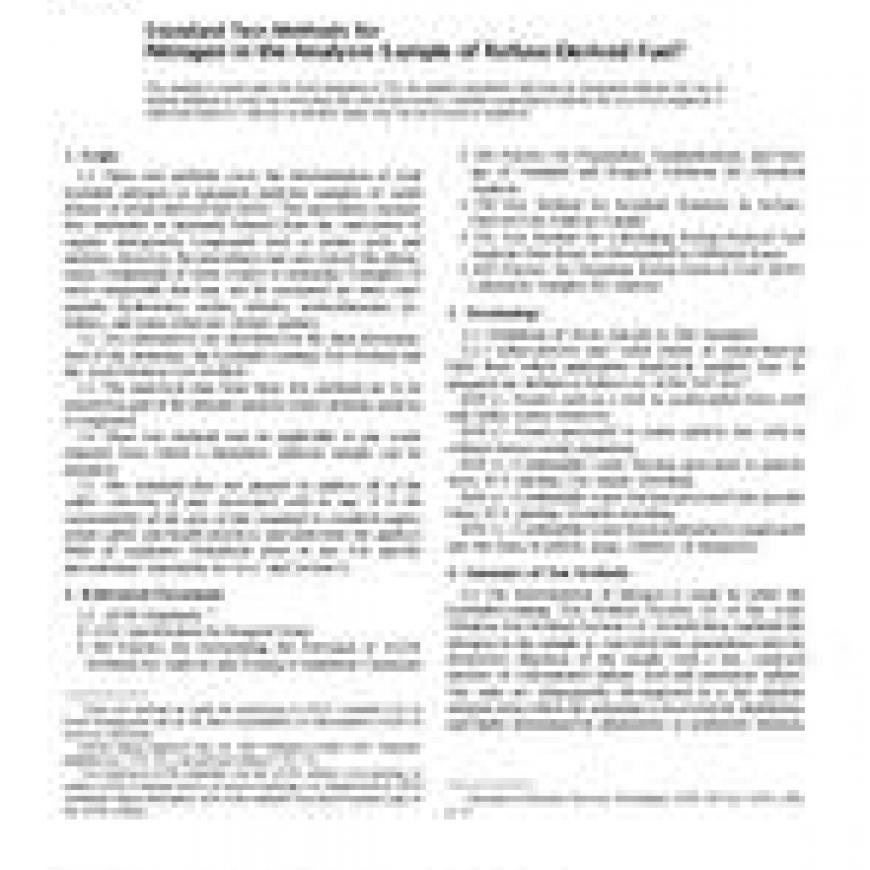 1.1 These test methods cover the determination of total Kjeldahl nitrogen in (prepared analysis) samples of (solid forms) of refuse-derived fuel (RDF). The procedures measure free ammonia or ammonia formed from the conversion of organic nitrogenous compounds such as amino acids and proteins. However, the procedures may not convert the nitrogenous compounds of some wastes to ammonia. Examples of such compounds that may not be measured are nitro compounds, hydrozones, oxines, nitrates, semicarbazones, pyridines, and some refractory tertiary amines.