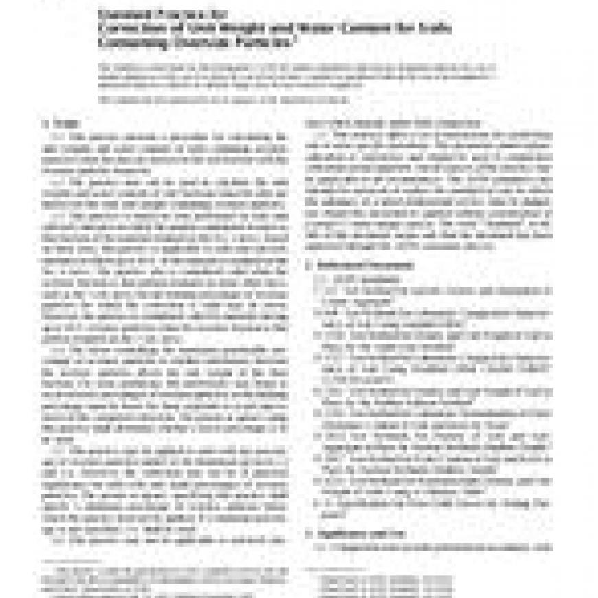 1.1 This practice presents a procedure for calculating the unit weights and water contents of soils containing oversize particles when the data are known for the soil fraction with the oversize particles removed.