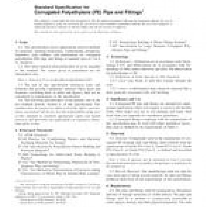 1.1 This specification covers requirements and test methods for materials, marking dimensions, workmanship, elongation, brittleness, pipe stiffness, and perforations for corrugated polyethylene (PE) tubing and fittings in nominal sizes of 3 to 6 in., inclusive.