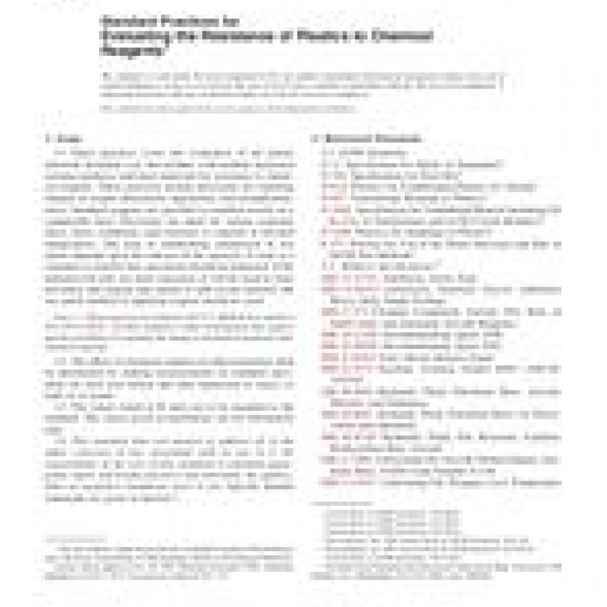 1.1 These practices cover the evaluation of all plastic materials including cast, hot-molded, cold-molded, laminated resinous products, and sheet materials for resistance to chemical reagents. These practices include provisions for reporting changes in weight, dimensions, appearance, and strength properties. Standard reagents are specified to establish results on a comparable basis. Provisions are made for various exposure times, stress conditions, and exposure to reagents at elevated temperatures. The type of conditioning (immersion or wet patch) depends upon the end-use of the material. If used as a container or transfer line, specimens should be immersed. If the material will only see short exposures or will be used in close proximity and reagent may splash or spill on the material, the wet patch method of applying reagent should be used.