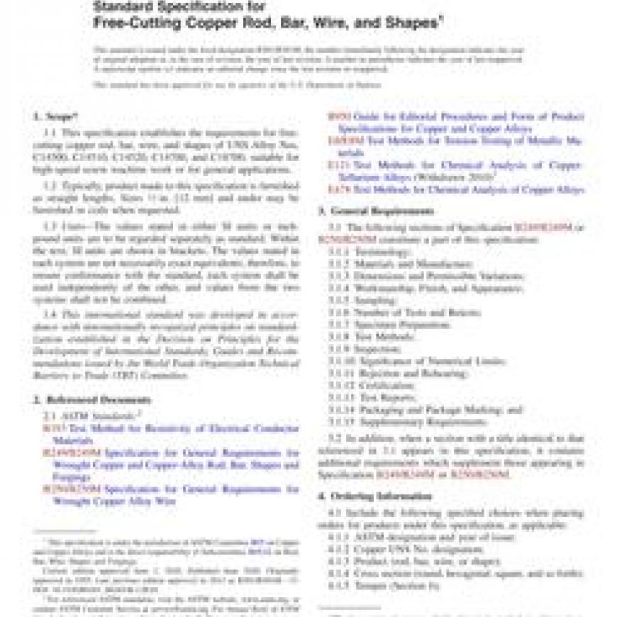1.1This specification establishes the requirements for free-cutting copper rod, bar, wire, and shapes of UNS Alloy Nos. C14500, C14510, C14520, C14700, and C18700, suitable for high-speed screw machine work or for general applications.